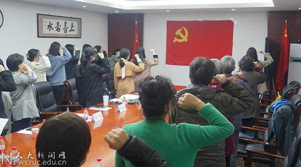 老中青三代党员面向党旗,全体党员庄严举起右手,重温入党誓词,对党庄严宣誓。