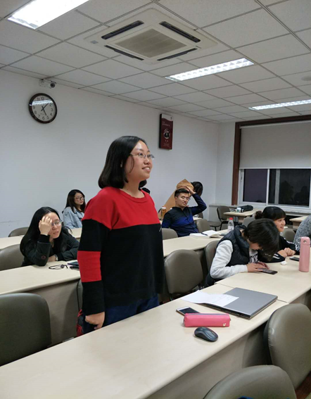 首先党支部书记杨钰晨分享了十九大的会议精神。她讲到:“我们一定树牢‘四个意识’,坚定‘四个自信’,更加紧密团结在以习近平同志为核心的党中央周围,不忘初心、牢记使命”。