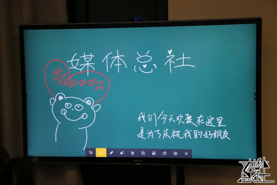 借着立德楼多媒体设备之便,活动准备之际,液晶显示器上尽是媒体总社才子才女们的创意涂鸦,他们用图画和艺术字表达了自己对于媒体总社大家庭的喜爱。