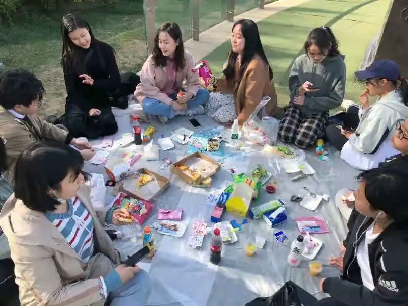 仲春的午后,阳光明媚。同学们沿着湖边行走,欢声笑语散入春风。在一块环形园地旁,大家停下来,在草坪铺上餐桌布,开始进行愉快的野餐游戏。大家在一起品尝披萨、炸鸡、蛋糕等食物,并进行轻松愉快的交流。