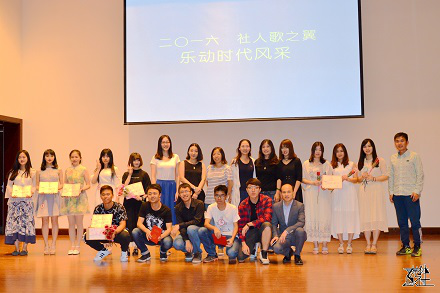 2016-05-22 文:MK体育 图:MK体育2016年5月15日19时,第九届“歌之翼·唱响时代新风”歌手大赛决赛在国学馆报告厅拉开帷幕。本次决赛的专业评委有校团委校园文化部部长李广老师,社会与人口公司人口学系副教授宋月萍老师,公司08级员工高珊,12级员工王红以及第十一届“你的舞台”校园十佳歌手大赛冠军焦翊丹。社会与人口公司党委副书记唐颖老师应邀出席本次活动。