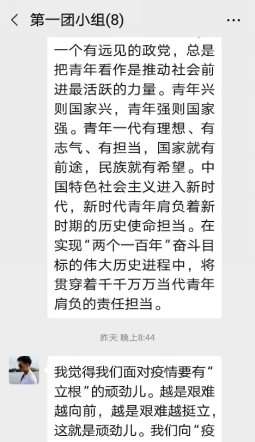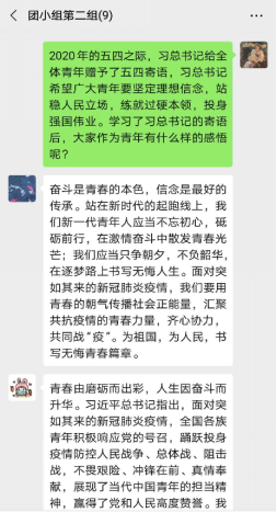 2018级本科1、2班团支部采用自主学习与线上交流的方式进行了此次主题团日活动。活动前各团员对习总书记五四寄语进行了学习,5月16日晚7点各团小组通过微信群交流了对于共青团员的责任与担当的认识。有的同学发表了对于爱国报国的看法,认为青年要用热血和信仰担当时代责任;有的同学对自己提出要求,希望通过志愿活动服务社会,做出表率;有的同学表达了对祖国日益强大的自豪,以及对抗疫同胞万众一心的敬佩与向往。同学们牢记习总书记对青年的要求与希望,在这次会议中深刻认识到自己的历史使命,对于自己的追求也更加明确。