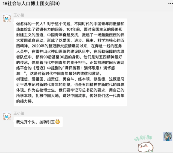 5月20日,2018级博士社会与人口团支部以微信群讨论的形式,围绕“青年”、“战疫”、“五四精神”等关键词,结合时下“后浪”精神展开了丰富的讨论。活动首先由支部书记对五四精神的理解开始,同学们谈及当今时代下五四精神在青年身上的传承,谨遵习总书记对当代青年的要求,立志用所学本领扎根中国大地,讲中国故事。团员们以自身专业为基础,给自己提出了丰富且深刻的要求。这次主题活动内容充实,增强了同学们对时代责任的理解和责任意识,让同学们坚定了在专业领域刻苦钻研的决心。