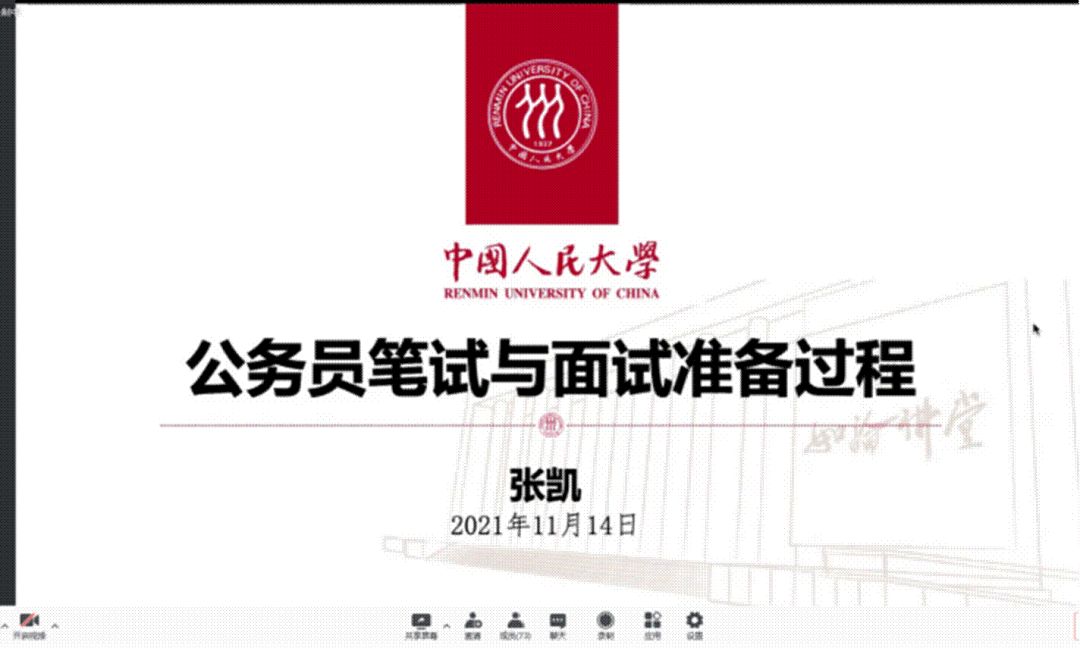 2021-11-17 文:MK体育 图:MK体育 为帮助同学们更进一步了解公务员就业情况,以明确自己的就业方向和更有针对性的进行规划备考,公司实战就业系列讲座—公务员专场经验分享会于11月14日晚19:00在线上顺利举办,本次分享会邀请到公司四位就职于机关单位的优秀毕业生,围绕求职经历、备考经验、工作感悟等内容与同学们交流分享,共吸引院内外70余名同学参会。