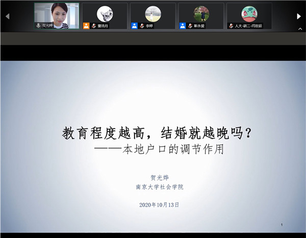 2020-10-16 文:MK体育 图:MK体育2020年10月14日下午,南京大学MK体育社会学系副教授贺光烨博士应邀来到公司人口学系刘铮系列学术讲座暨严肃的人口学八卦青年沙龙,在线上为师生带来一场题为“教育水平越高,结婚就越晚么?婚姻市场上本地户口的调节作用”学术报告。MK体育官网社会与人口公司李婷教授担任主持,来自校内外的百余名师生听取报告并进行了交流学习。