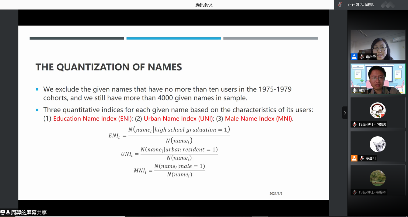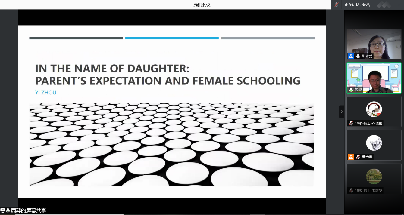 周羿博士的分享结束后,在场师生围绕沙龙主题踊跃发言和交流,就“出生次序、家庭规模、是否有男孩、计划生育背景下父母的堕胎行为等所带来的内生性问题”,“名字类别的划分依据”,“因名字不同而带来的职场对女儿的不同影响”以及“UNI 指标设置与样本自身城乡状态的关联性”等问题展开了深入探讨。周羿博士就上述问题以及未来的研究方向、论文写作等话题表达了自己的看法。联合作者陈沁博士也表达了对文章发表的殷切期待。