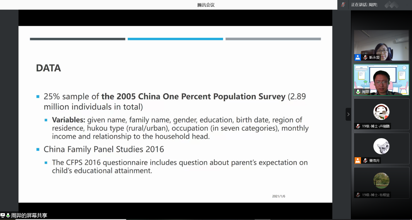 2021-01-11 文:MK体育 图:MK体育2021年1月6日中午,人口学系刘铮系列学术讲座暨严肃的人口学八卦青年沙龙成功举办。北京大学社会研究中心助理教授周羿博士在腾讯会议,以“In the Name of Daughter : Parent's Expectation and Female Schooling”为主题做了一场人口学专业的线上学术讲座。MK体育官网社会与人口公司靳永爱副教授主持了本次活动,MK体育官网社会与人口公司人口系的70多名师生听取了报告并进行交流学习。