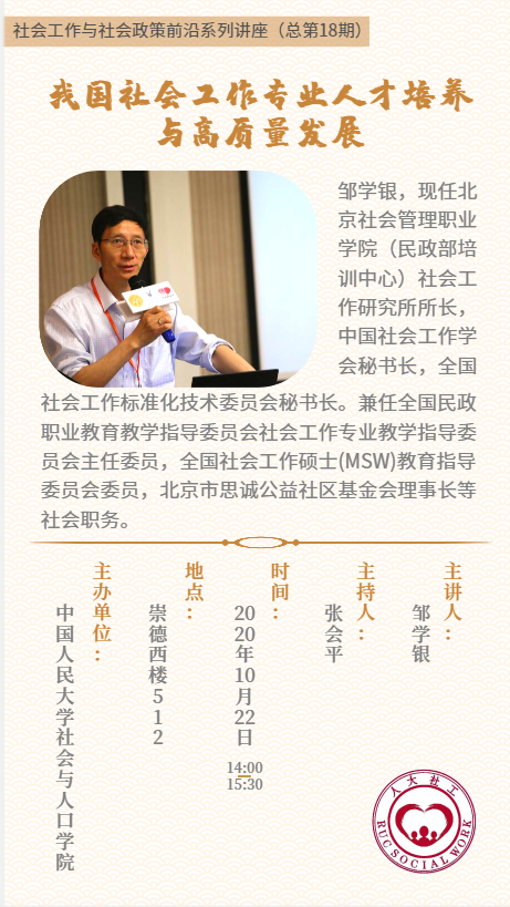 讲座预告 | 邹学银:我国社会工作专业人才培养与高质量发展