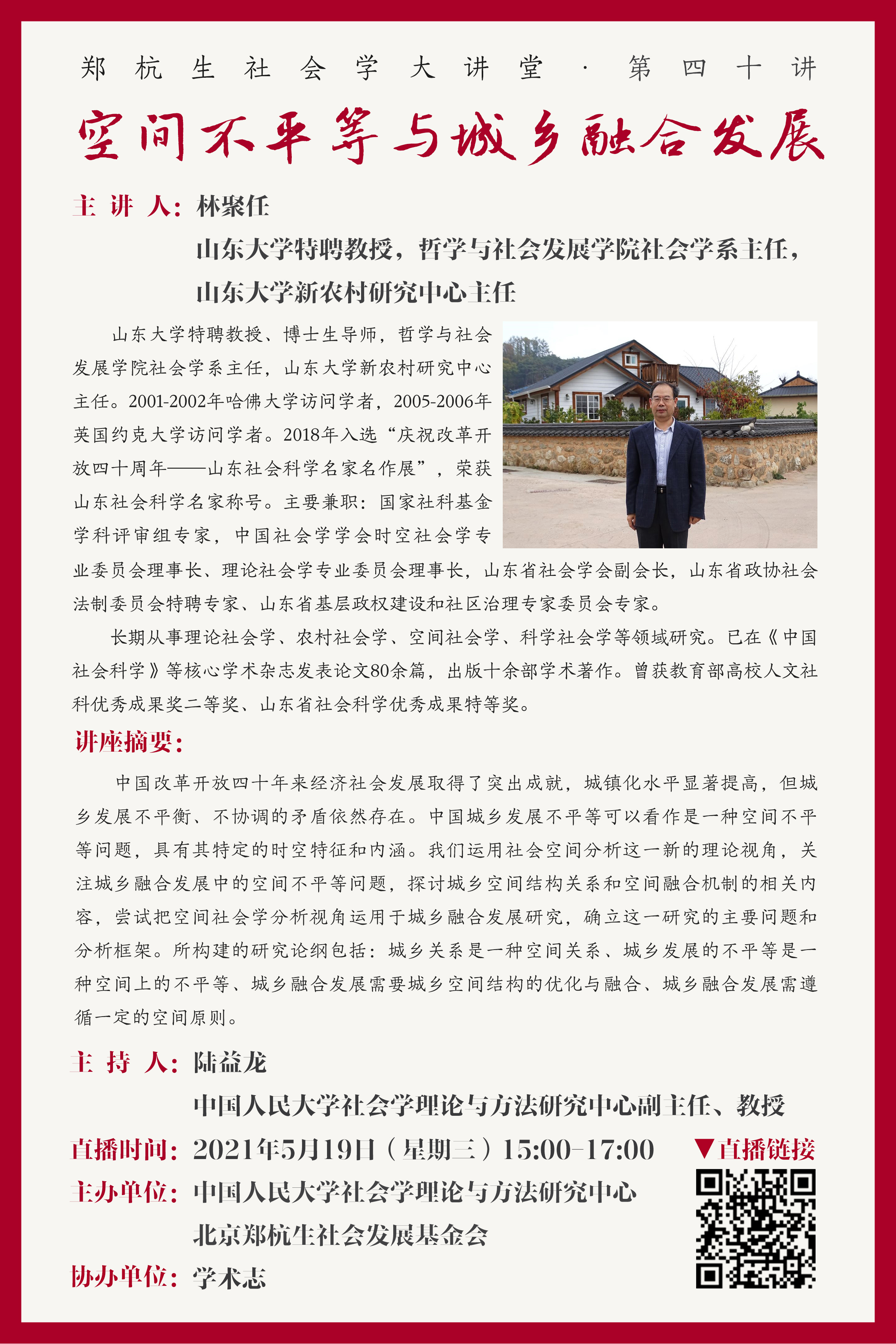 讲座预告 | 郑杭生社会学大讲堂 第四十讲:空间不平等与城乡融合发展