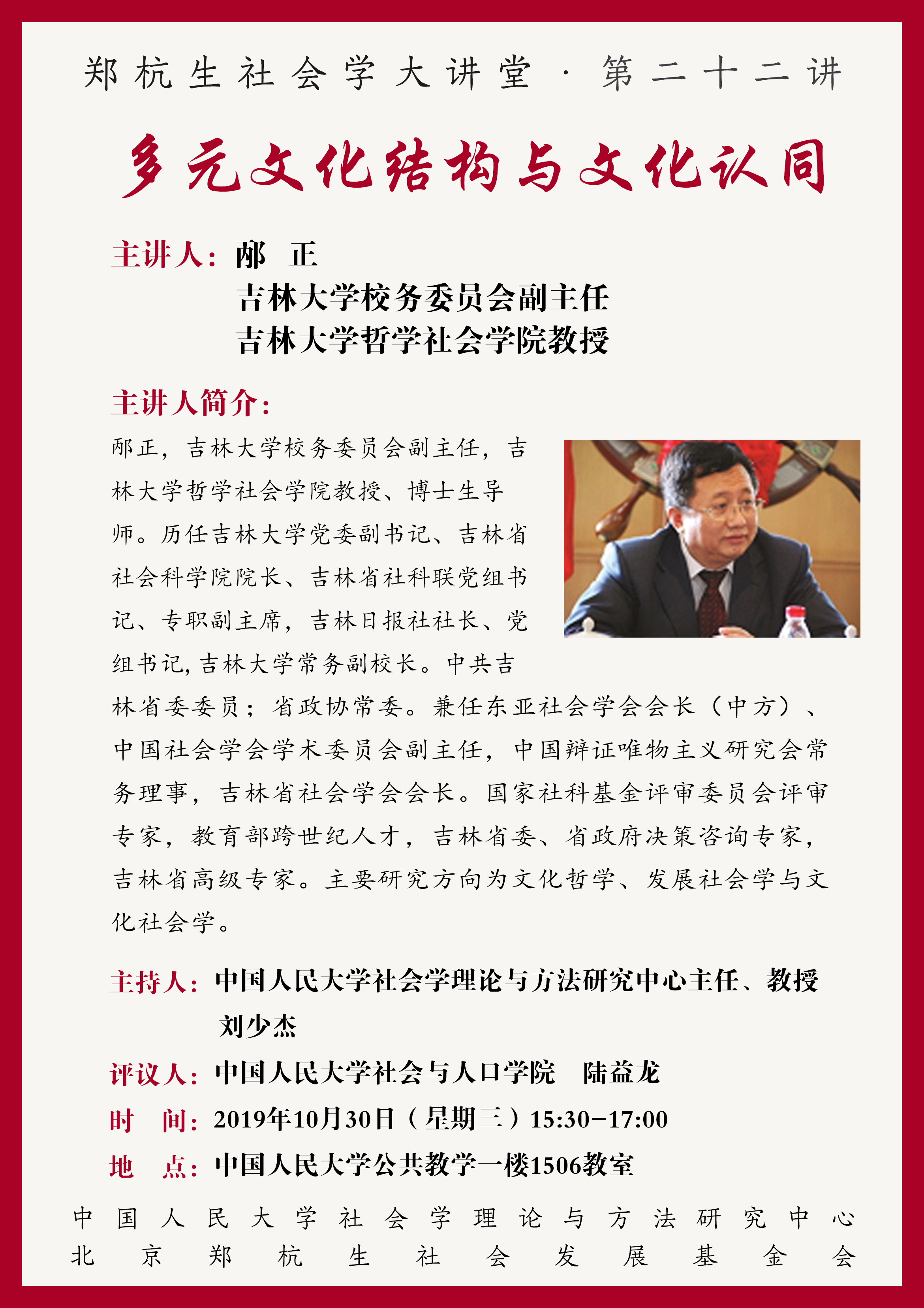 温馨提示:此次讲座在校生可在学务中心搜索”郑杭生社会学大讲堂第二十二讲”报名参加,签到后可领取活动积分;外校同学可自行参加。