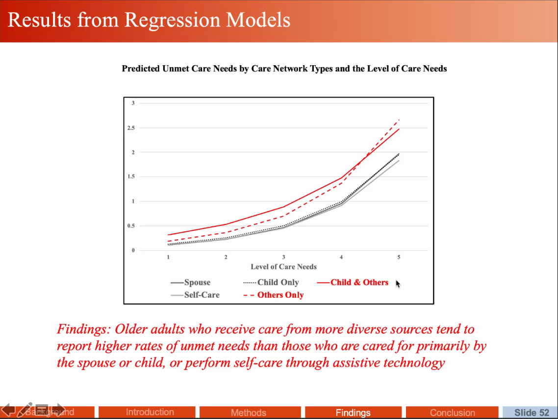 林志勇博士本次讲座分享的研究聚焦美国老年人的长期照护(Long Term Care)的供给与需求两方面,利用美国国家健康和老龄化趋势调查(National Health and Aging Trends Study)2011-2018年的8期纵向数据,从生命历程理论视角对Andersen 1995年提出的照护使用行为模型(Behavioral Model of Care Use)进行拓展运用。通过潜在类别分析、多项式逻辑回归模型、潜在转变分析等分析方法,研究发现老年人的照护供给可以根据提供者划分为5个类别和2类老年人自我照护类型,且存在显著的性别和种族差异,女性更多依靠子女,男性则更依赖配偶,白人主要依靠配偶,黑人和拉丁裔则更多由子女提供照护,进一步回归分析发现,如果条件允许,老年人更愿意寻求配偶照料。研究还发现24%的样本经历了至少1次照护网络的变化,主要的驱动因素时丧偶和居住地迁移。以上发现表明老年人的照护网络不是单一单调的而是动态多元的。随后林博士对老年人未满足的照护需求(Unmet Care Needs)进行了介绍,根据已有研究约20-40%的美国老年人的照护需求未得到满足,未满足的照护需求会对老年人的健康和生活造成诸多不良影响,林博士的研究通过12个指标对未满足需求的后果进行测量,并对照护网络与未满足的照护需求的关系进行分析,林博士的研究团队提出了一套照护网络协作的多层次概念框架(Multilevel Conceptual Framework of Care Network Collaboration)。分析发现,老年人未满足的照护需求主要受照护需求等级影响,黑人与白人不存在显著差异,但拉丁裔女性以及拉丁裔移民男性的未满足需求情况要差于其他群体,性别和种族的不平等情况依然存在。在照护网络方面,照护提供者更多元的两类照护网络的未满足的照护需求情况更严重,这可能是由配偶和子女提供照护的传统照护网络更受老年人信任和接受,其他新近出现的照护形式组成的多元网络在服务质量和接受程度上存在一定缺陷,导致了更多未满足的照护需求。