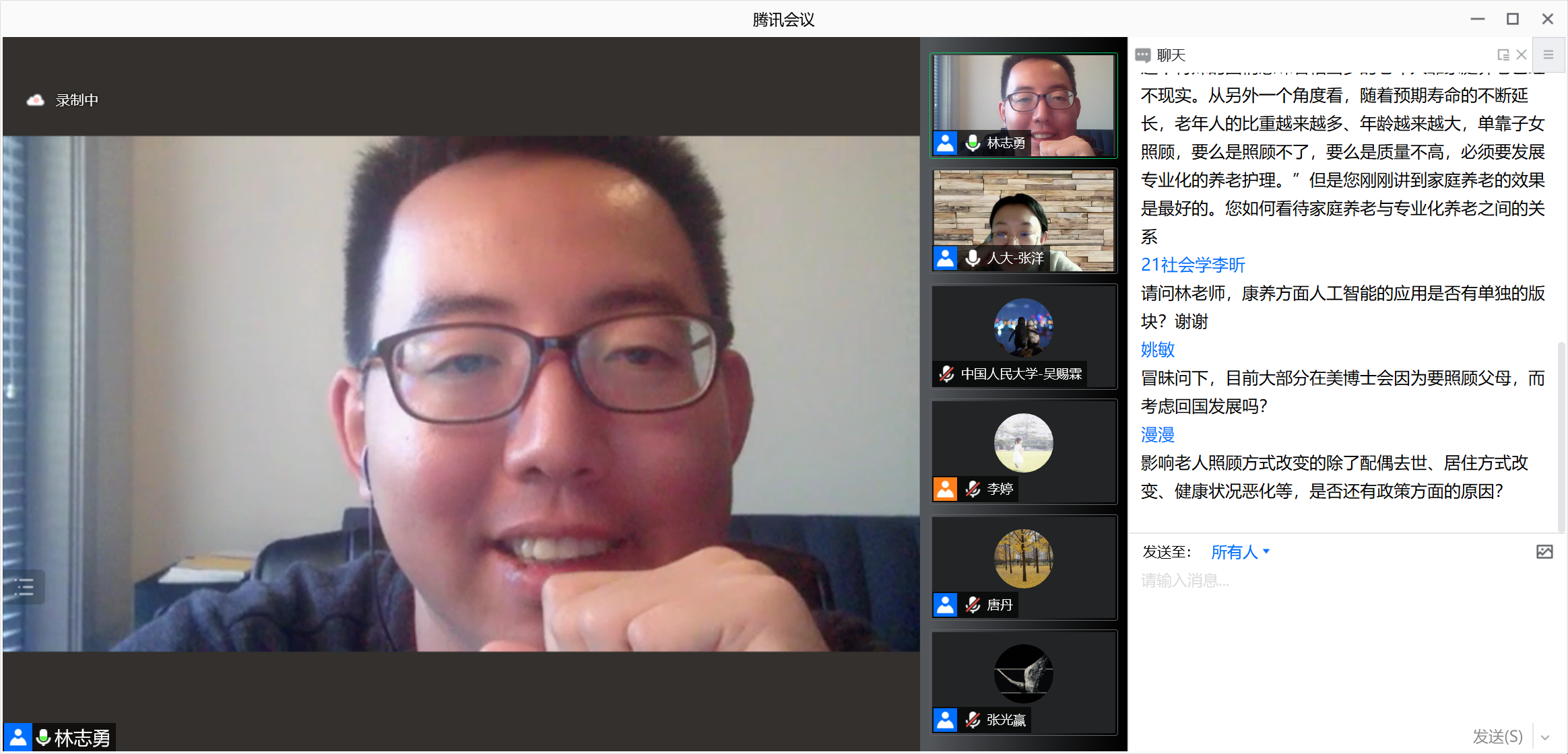 最后林博士总结现在不应该只关注应该由哪个单一的主体来负责照护老人,而应该思考如何让政府、社区、家庭以及老年人自身共同合作提供更好的照护服务。讲座分享结束后,参会的老师和同学踊跃提问,就“如何衡量照顾者之间的合作情况”、“家庭照护提供者的重要性和照护压力”、“如何看待家庭养老与专业化养老之间的关系”、“如何理解美国的家庭养老”、“美国家庭养老支持政策”和“如何测量老年人的未满足的照护需求”等问题与林博士进行了热烈而富有成效的探讨。