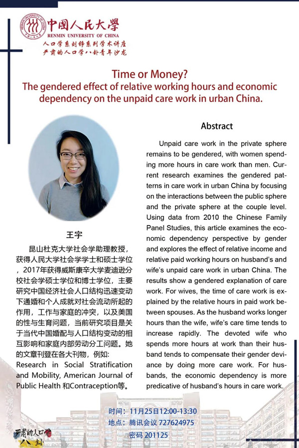 讲座预告 | 王宇:时间亦或是金钱?相对工作时间和经济资源对城市男女照料家人时间的差异性研究