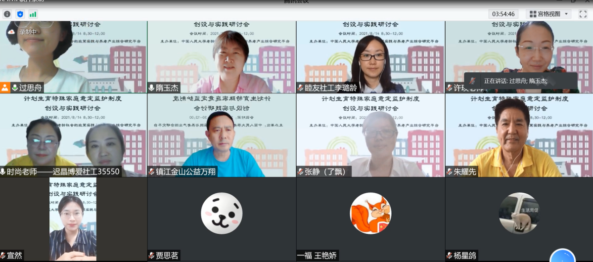 2021年8月14日,计划生育特殊家庭意定监护制度的创设与实践研讨会顺利举办。该论坛由MK体育官网老龄社会的政策实践与养老产业综合研究平台主办,北京睦友社会工作发展中心、上海闵行区尽善社会监护服务中心、江苏省镇江市慈善(红十字)金山公益志愿服务总队、常州春晖爱心家园、延边朝鲜族自治州光芒爱心公益协会、北京市第一社会福利院社工科、北京工业大学耿丹公司家庭发展与研究中心等单位的代表参加了该论坛的研讨。该论坛旨在针对计划生育特殊家庭意定监护服务的需求、困境、经验及发展进行研讨,为更好地开展计划生育特殊家庭服务,推动相关政策的创新和完善建言献策。参加研讨会的还有相关机构的工作人员、志愿者和社会与人口公司的博士生、硕士生。