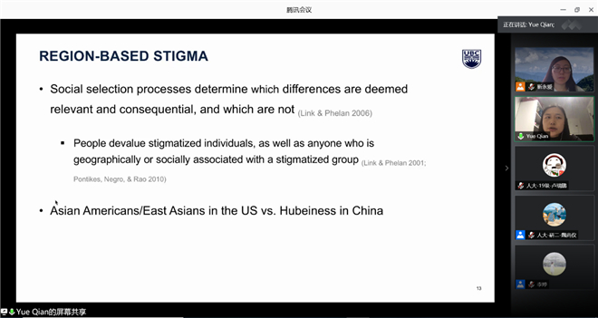 钱岳博士分享结束后,在线师生围绕沙龙主题踊跃发言和交流,就“疫情防控与污名化传播的关系”、“访谈对象的选择”、“污名化与歧视的概念辨析”以及“混合研究方法介绍”等问题展开了深入探讨。钱岳博士详细回答了上述问题,并就未来的研究方向和论文写作等话题提出了一些想法和大家交流。
