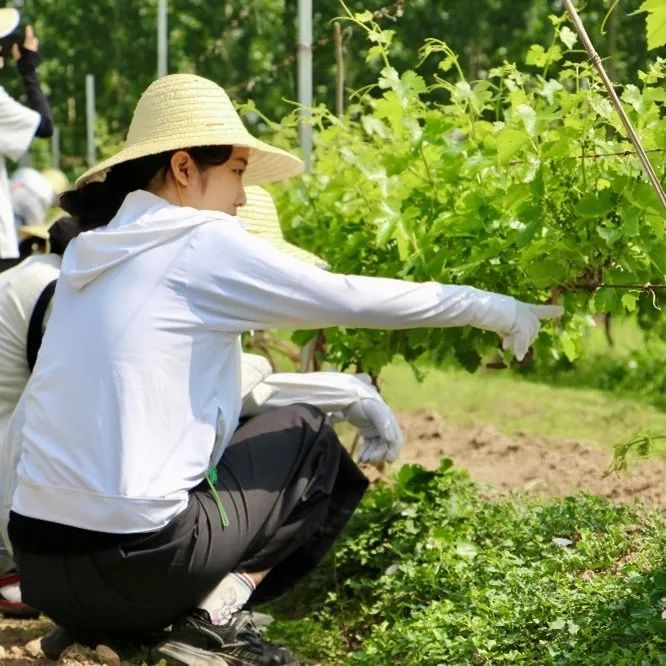 5月14日上午,同学们前往葡萄田进行劳动,在田间老师的指导下细心辨认主干上的枝蔓,清理田垄上的杂草,互相戴上被牵牛花装点的草帽,俏皮中也带上些对土地的不舍,大家共同期待着葡萄能够顺利结果、缀满藤架。