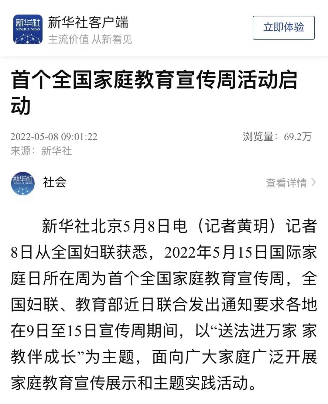2022年5月15日是国际家庭日,其所在周为中国首个“全国家庭教育宣传周”,全国妇联、教育部近日联合发出通知,要求各地在9日至15日宣传周期间,以“送法进万家 家教伴成长”为主题,面向广大家庭广泛开展家庭教育宣传展示和主题实践活动。