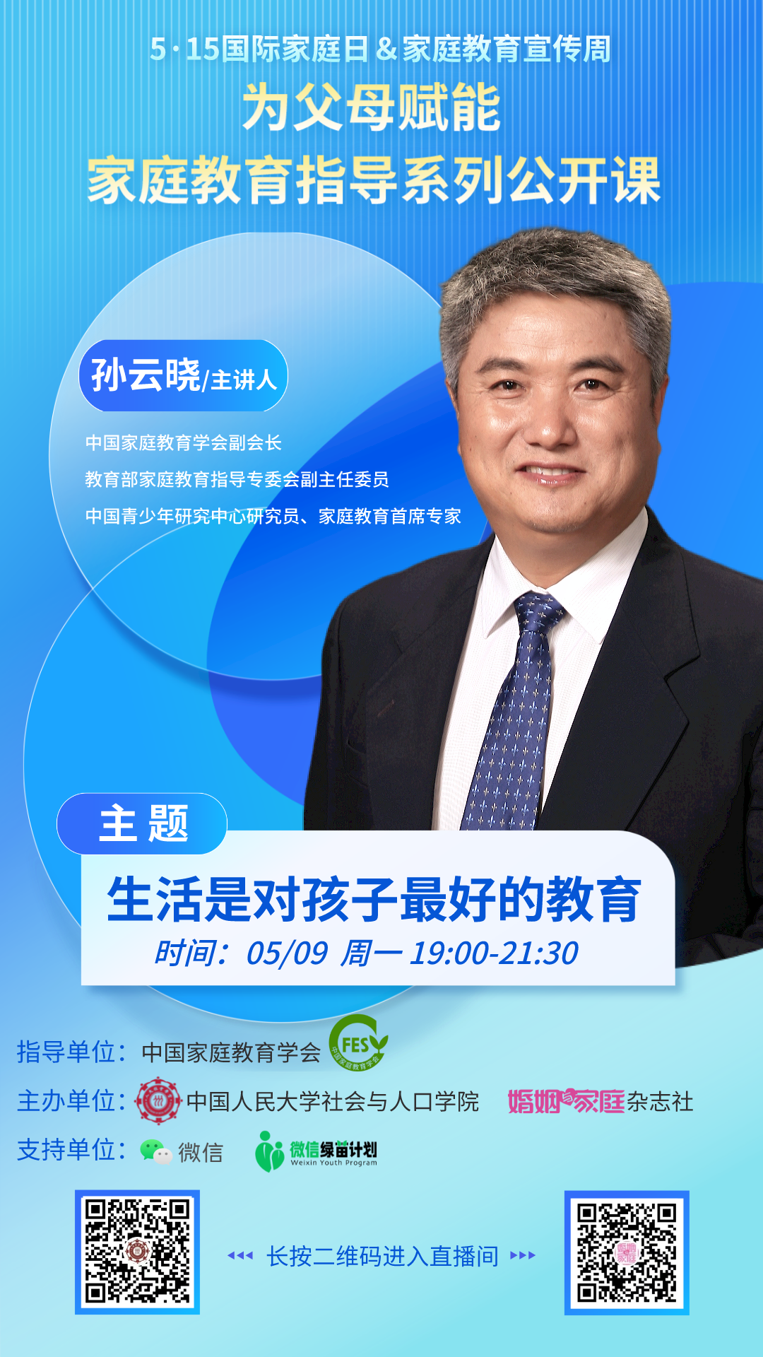 2022-05-09 文:MK体育 图:MK体育5月9日晚,著名家庭教育专家孙云晓在“人大社会学堂”视频号做了题为“生活是对孩子最好的教育”公开课。这是社会与人口公司积极响应全国妇联、教育部主办的全国“家庭教育宣传周”活动的开篇。