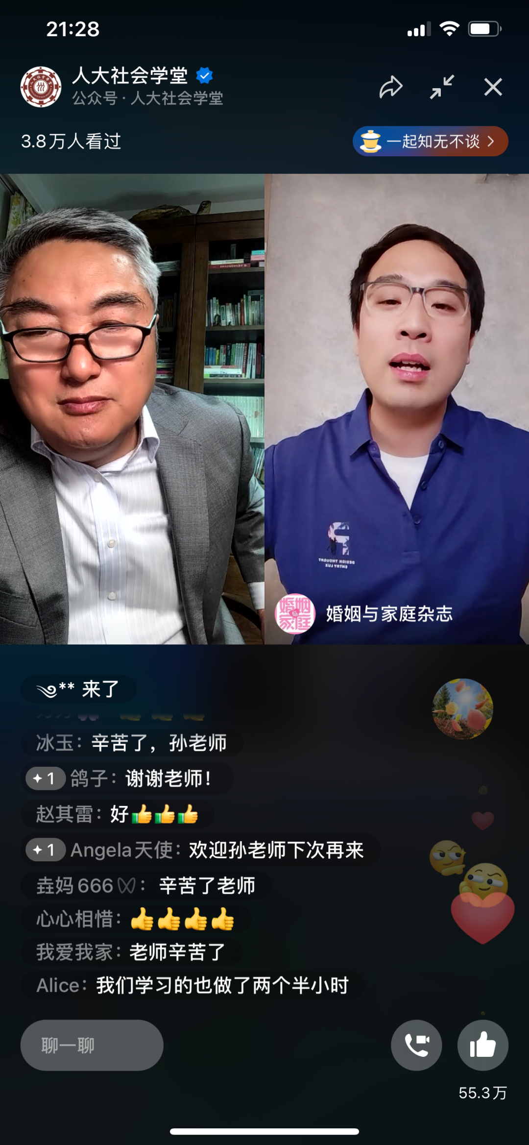 中国家庭教育学会副会长,教育部家庭教育指导专委会副主任委员孙云晓做首场开讲嘉宾。他倡导教育的宗旨是立德树人,而人首先必须会生活,不仅包括孩子当下的学习生活,也包括孩子走入社会后的人生生活。他指出,从家庭教育的角度来看,当前丰富多彩的生活教育被扭曲为单一功利的知识教育,已经成为家庭教育的巨大误区。直播现场精彩热烈,人大社会学堂和婚姻与家庭两个视频号共7万余人观看了直播,并就讲座内容与孙老师进行了积极互动,点赞数超过85万。