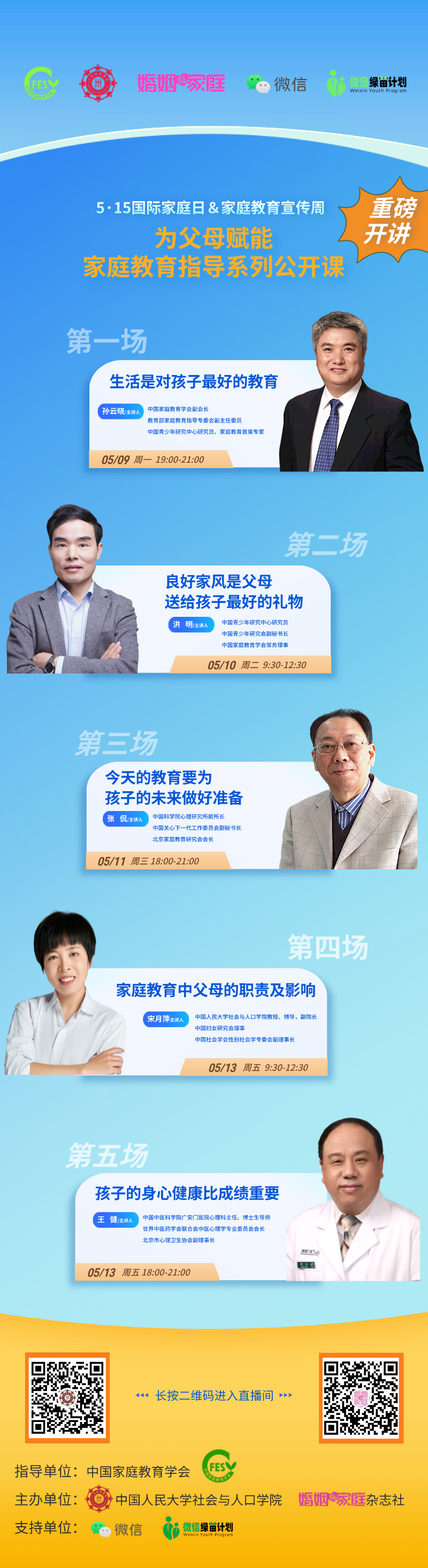 公司在中国家庭教育学会指导下,联合《婚姻与家庭》杂志社,邀请孙云晓、张侃、洪明、宋月萍、王健五位家庭教育领域知名专家,于5月9-13日通过微信视频号开展“为父母赋能”家庭教育公开课系列直播,为父母提供科学化、专业化、规范化指导,强化父母主体责任,帮助父母答疑解忧。