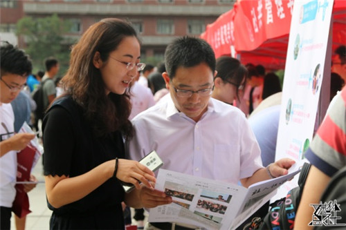 公司领导查看新生宣传资料