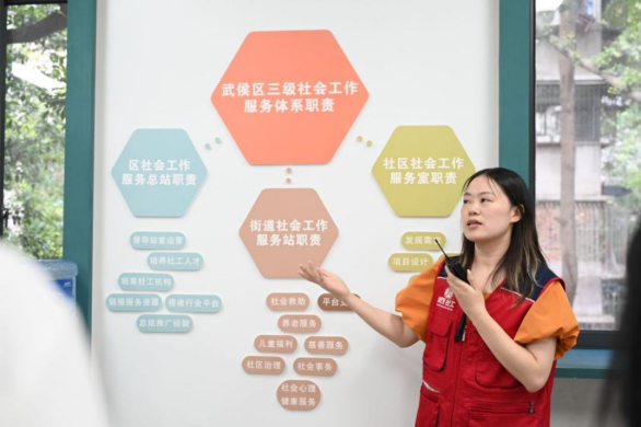 最后,师生们到达武侯区社会工作服务总站进行参观。社工总站的讲解员为师生介绍了总站的建设情况。武侯区社会工作服务总站是武侯区社工总站、玉林街道社工站以及倪家桥社区工作室的三级联建基地。总站按照政府扶持、社会承接、专业支撑与项目运作的方式运营,提供包括党建指导、人才培训、组织孵化、行业支持等专业化服务。根据省级、市级政策指示以及本区治理情况,武侯区社工服务体系设置了工作方针,依托于社区的党群服务中心,在方针的指导下建立实体平台,打造了品牌项目——“5S社工体系”。