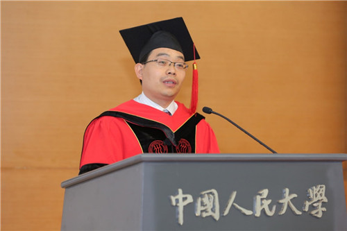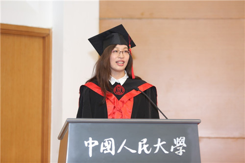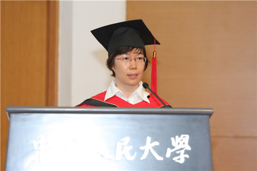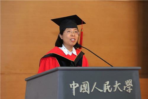 宋月萍作为教师代表发言。她诙谐幽默地与大家共同回忆了在人大生活的点点滴滴。她特别强调,毕业生们即将开启新的人生,需要时刻保持强大的内心、坚定自己的选择,要相信持之以恒的努力终将得到回报。她向辛苦抚养孩子长大的父母们表示感谢,并祝愿各位毕业生们前程似锦、生活幸福。