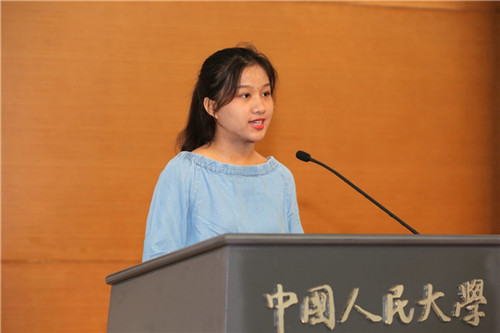 2016级本科生刘翰韬代表在校生发言。她回忆了入校以来师兄师姐一路的帮助和鼓励,对毕业同学们表达衷心的祝贺和感谢,祝愿大家今后能够乘风破浪、前程万里。