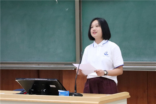 本科2018级新生代表杨怡佳随后代表2018级新生发言。她表达了新同学对即将到来的老员工活的期待。